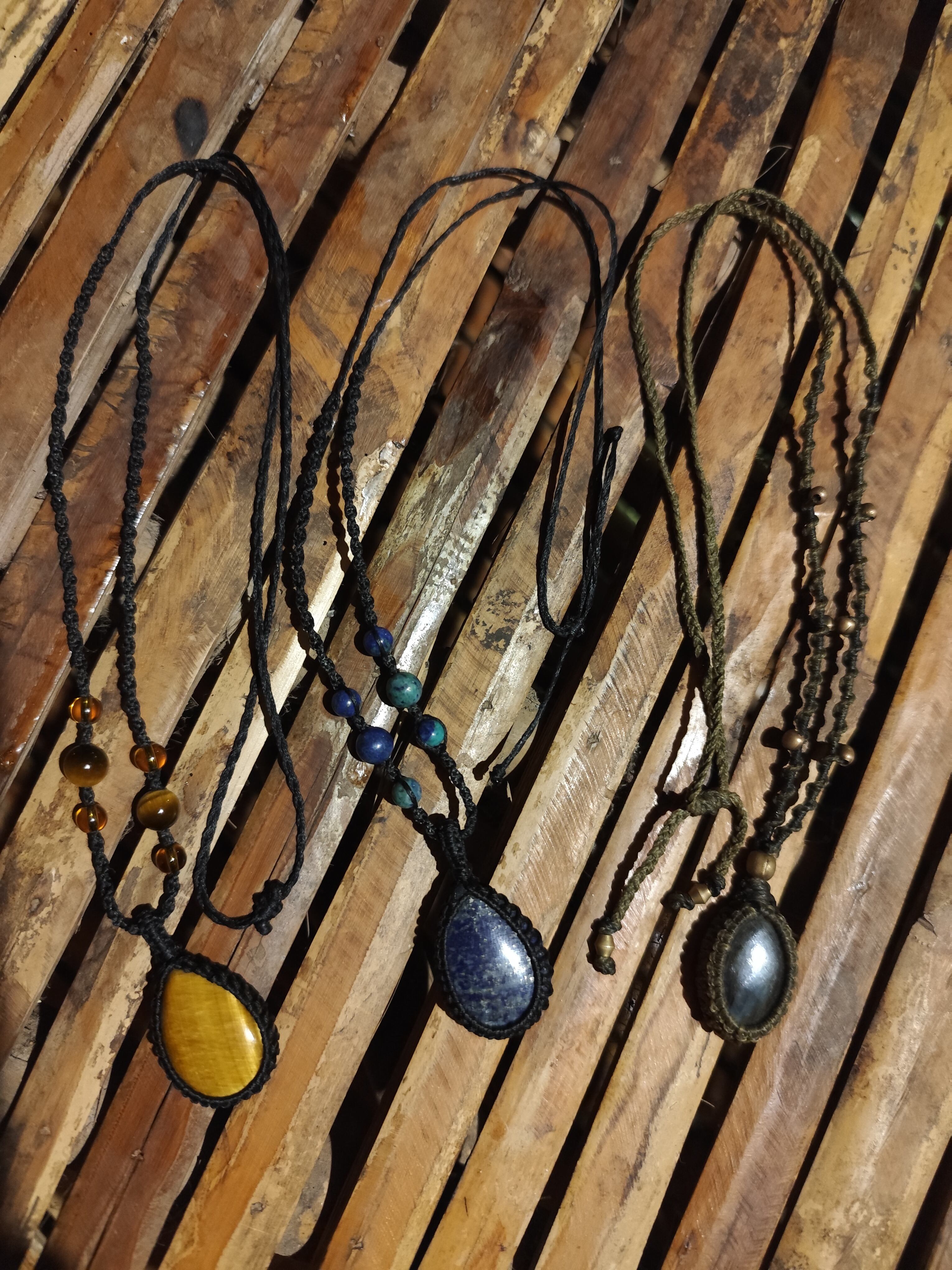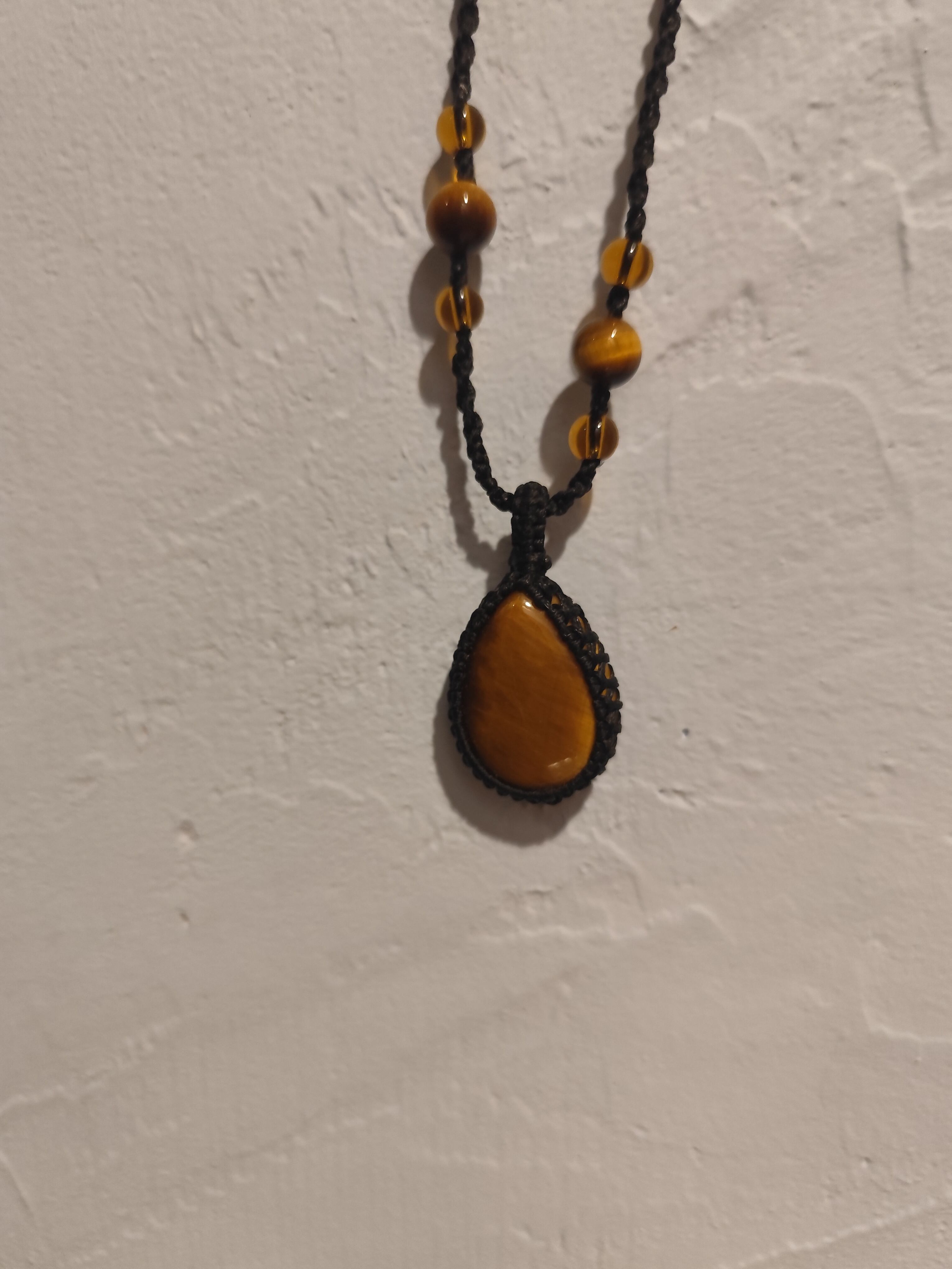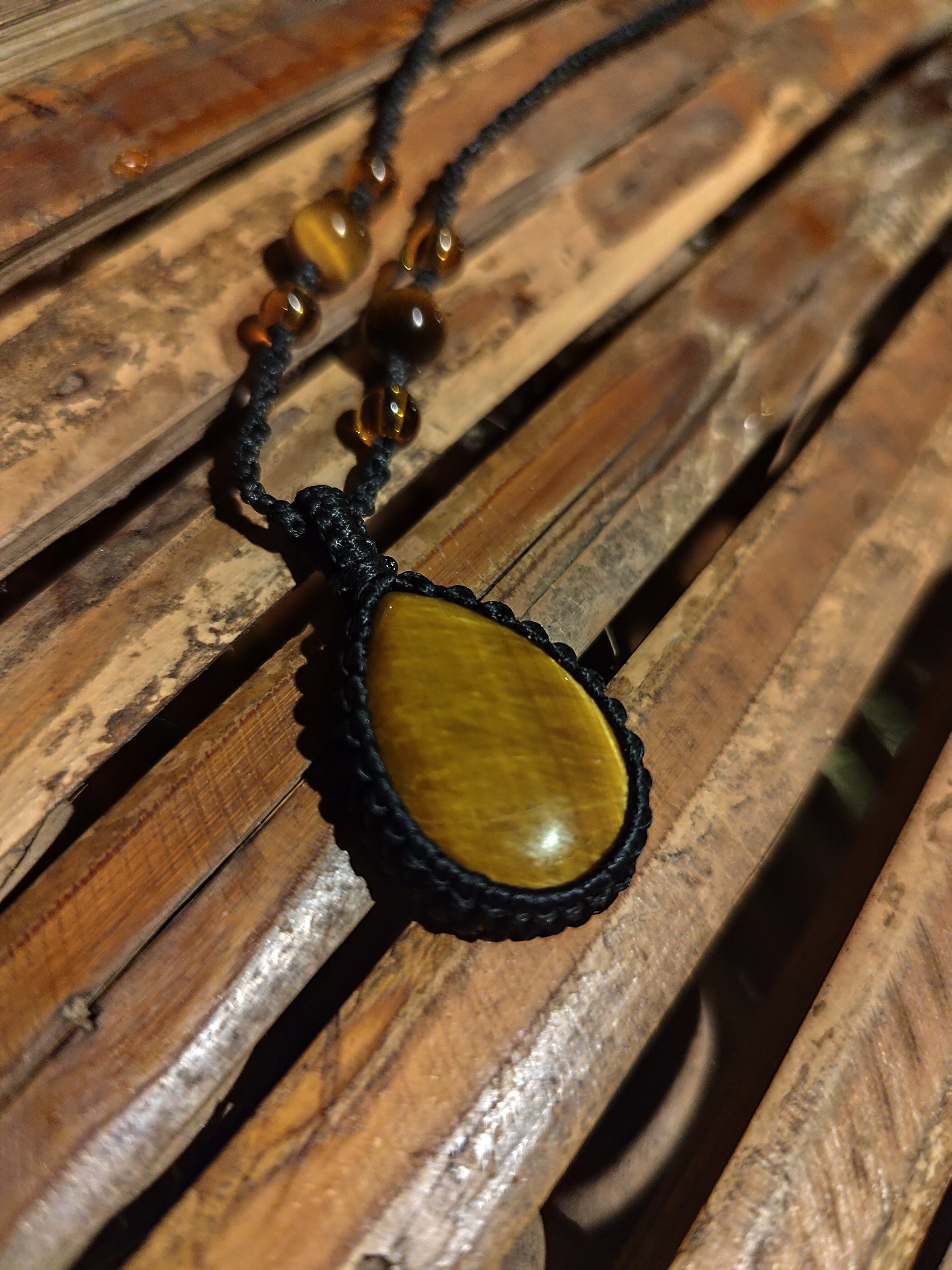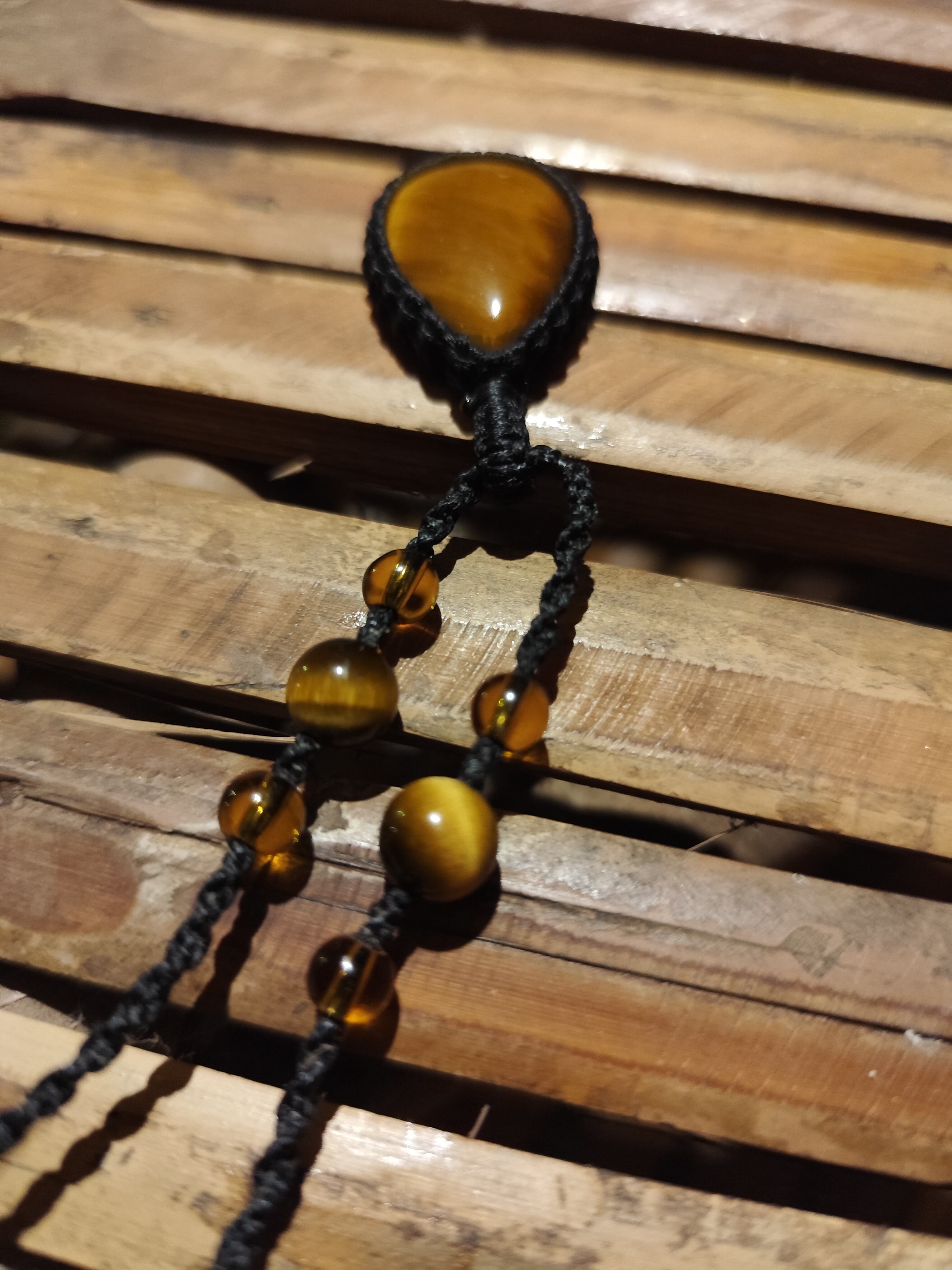 カンボジアの職人さんにマクラメ編みで製作してもらったハンドメイドの一点物のネックレスです。タイガーアイは世界中で古くから洞察力や決断力を上げる天然石と言われ、魔除けとしても身に着けらてきました。