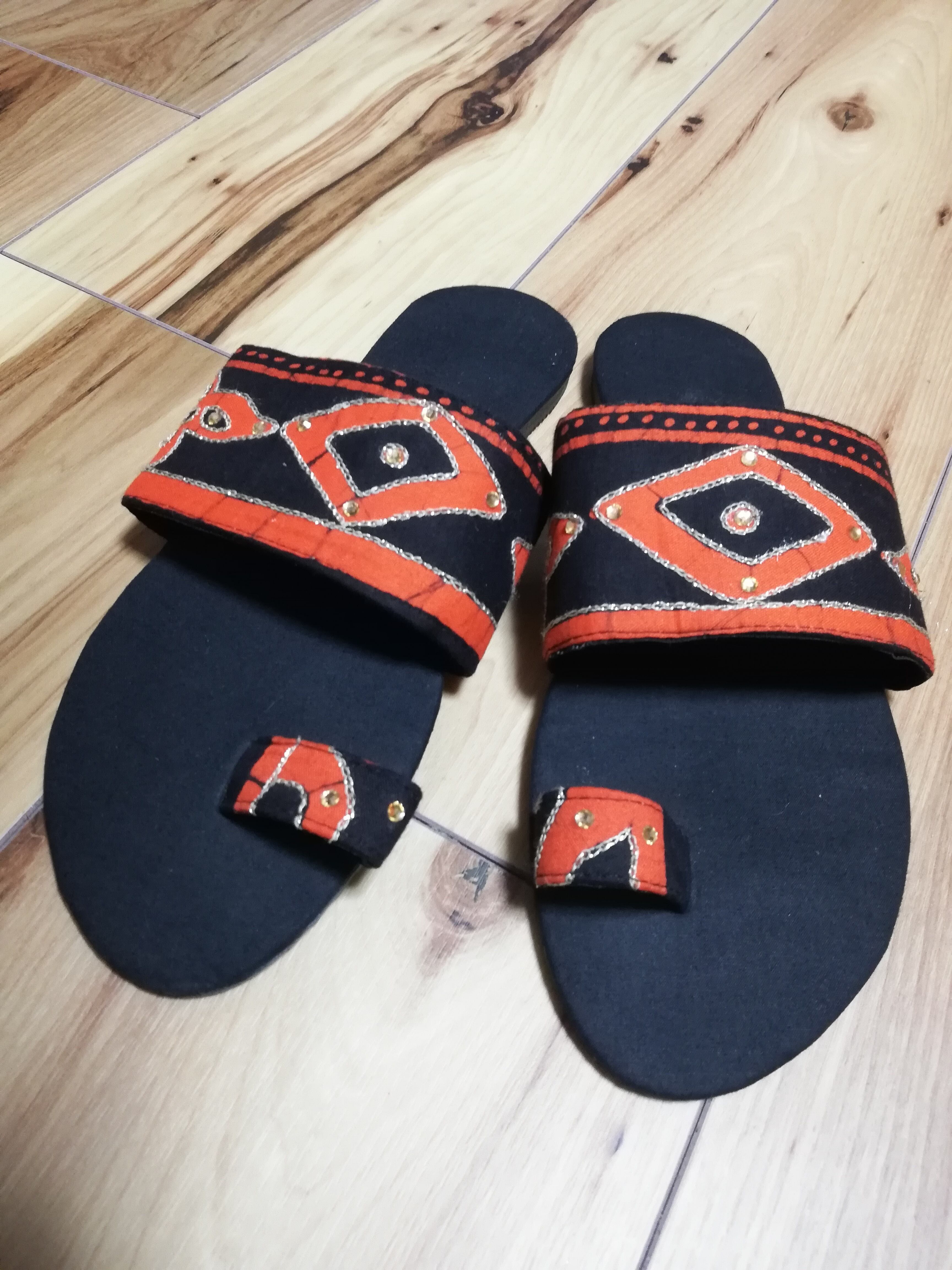 スリランカの生地を使いハンドメイドで作られたサンダルです!ビーズで所々装飾されています!