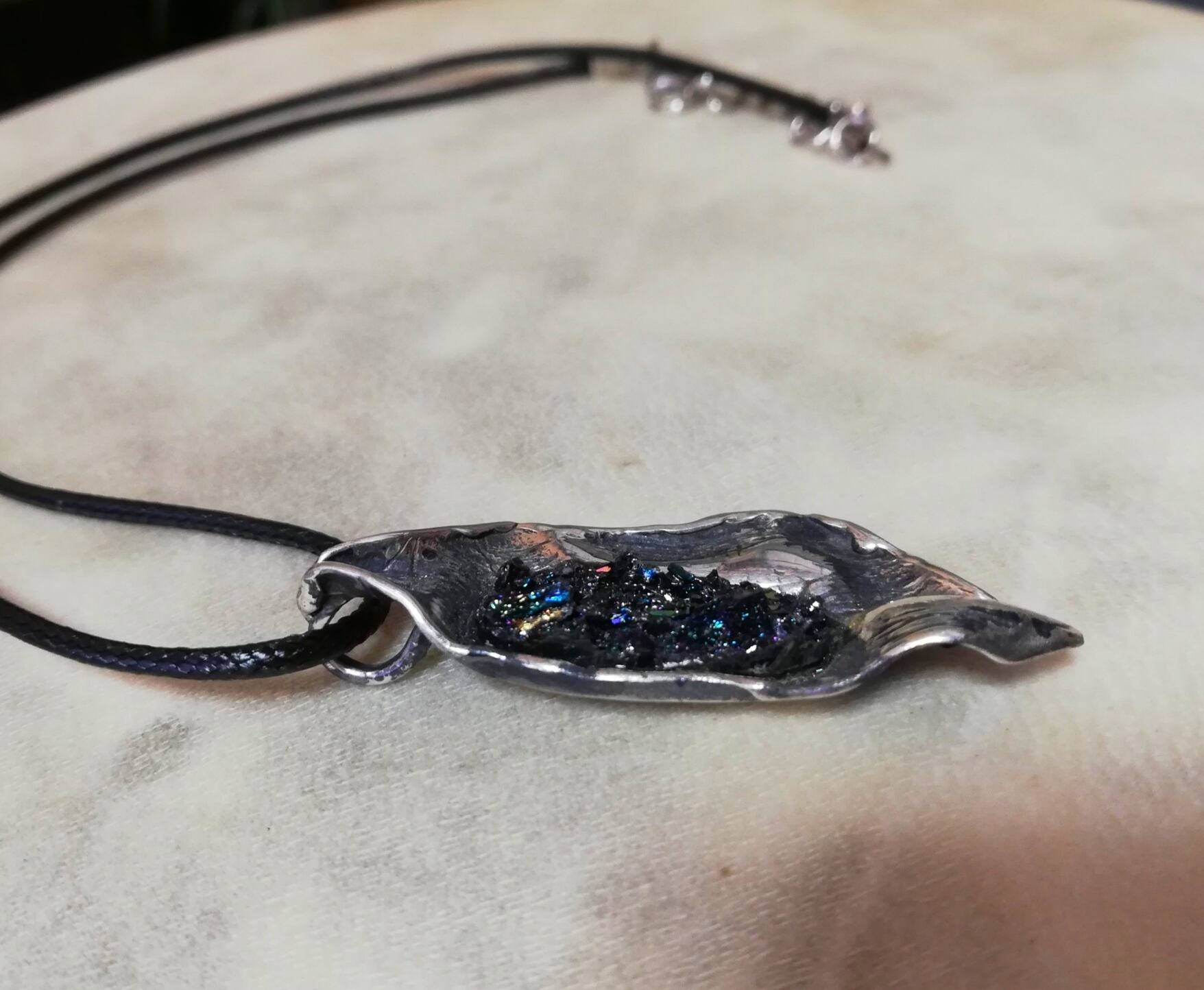 光があたると美しく不気味に七色に輝くレッドピリーツの特性をそのまま活かして作られたシルバーネックレスで、付けてみるとシンプルなのに個性的で不思議な力を感じる世界に1つだけの品物です!