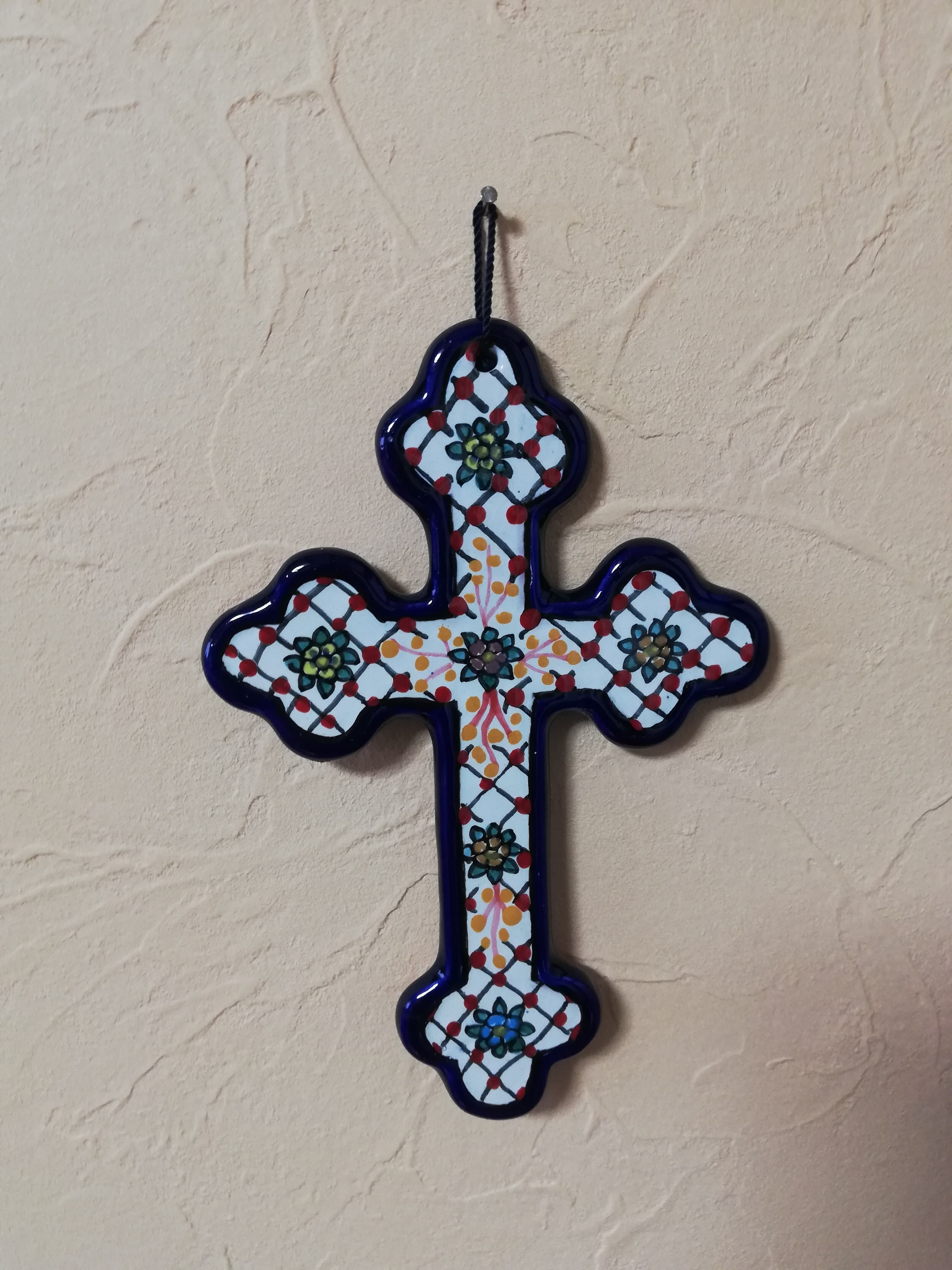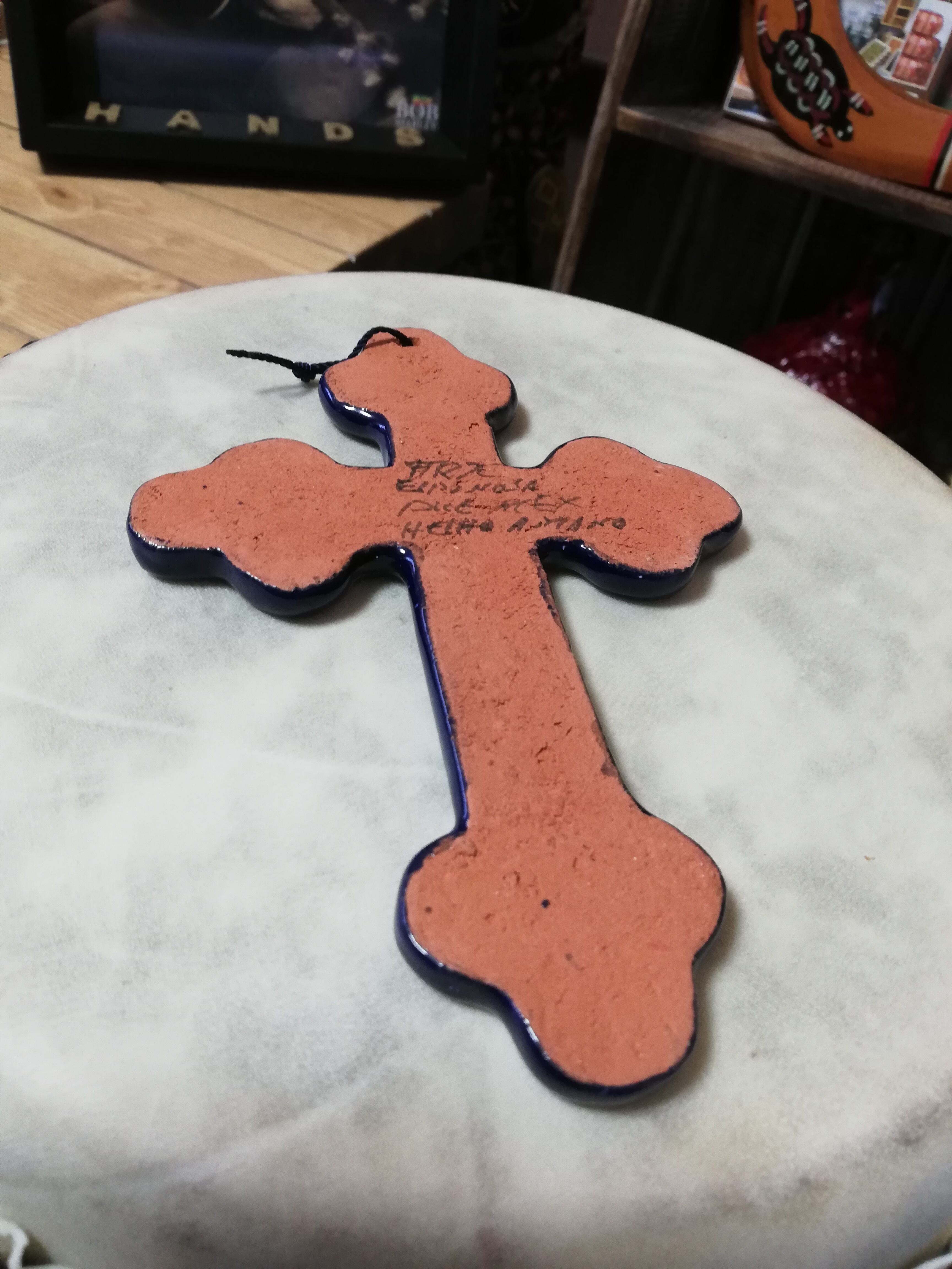 メキシコで十字架の陶器にメキシカンアーティストが絵を書いたオブジェです!置いても壁にかけてもかわいいく飾れます(^^)