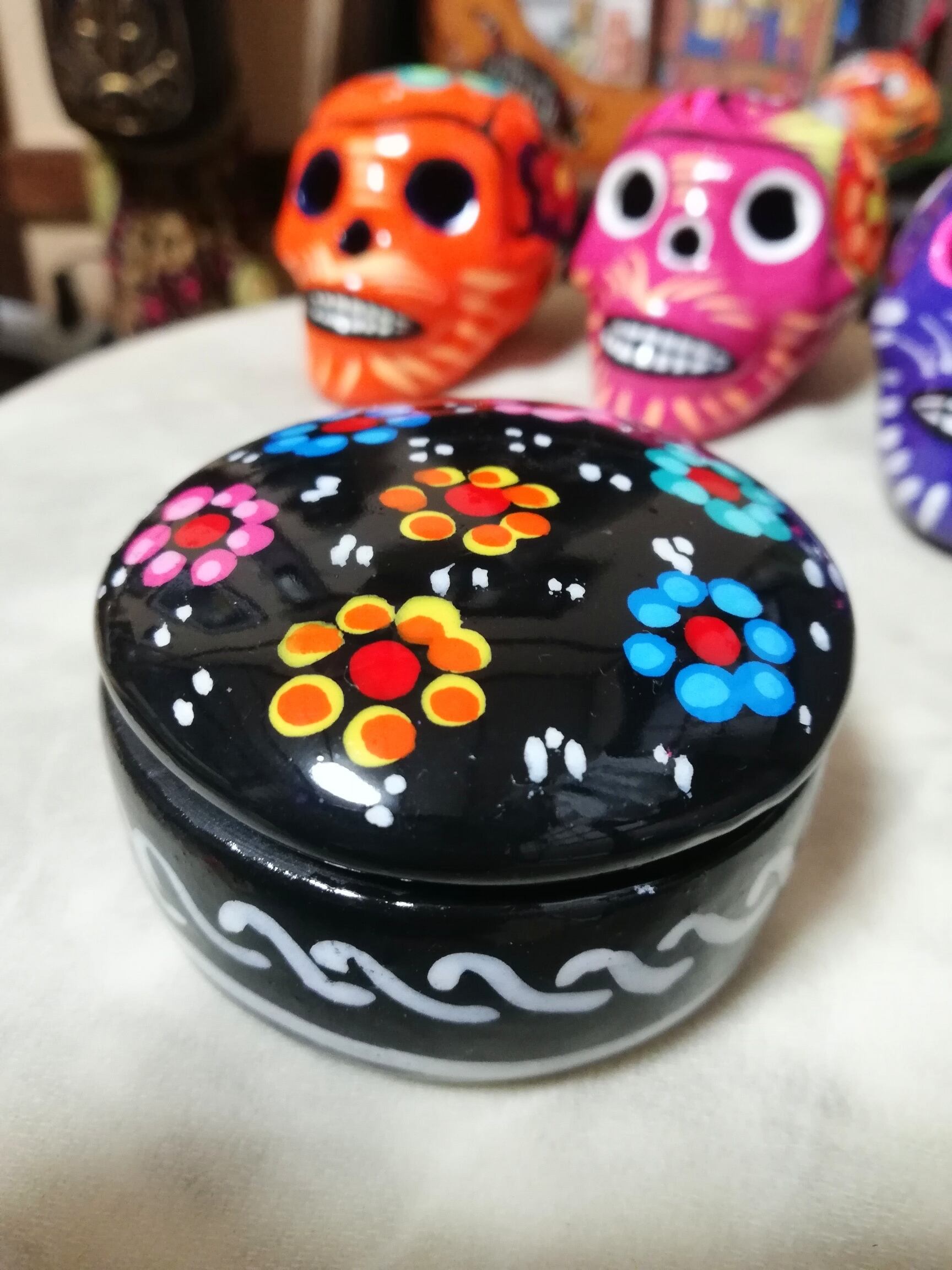 陶器で作られた蓋付きケースにメキシカンアーティストがハンドメイドペイントした可愛らしいオブジェです!(^^)並べるとさらにかわいいです!!