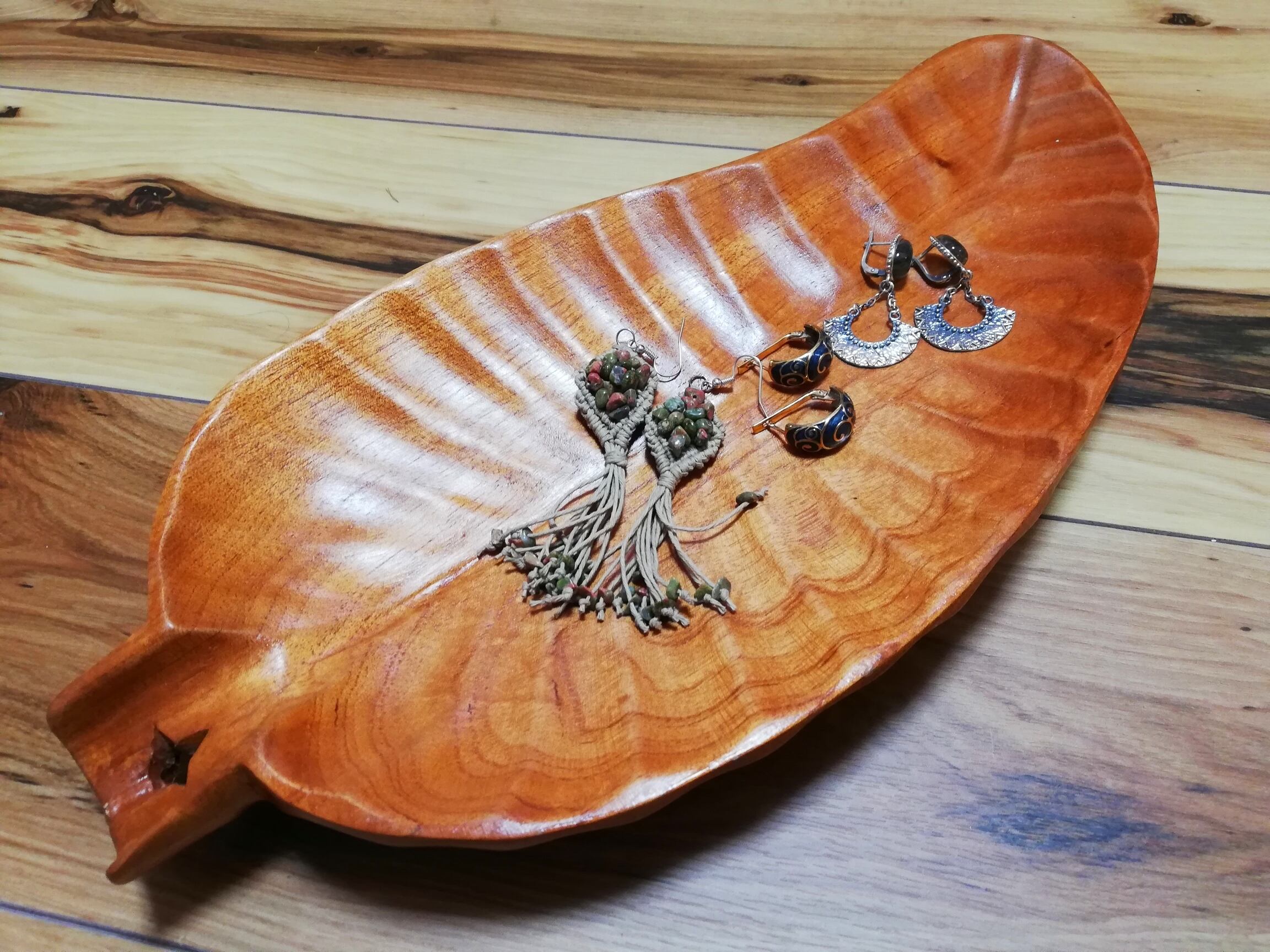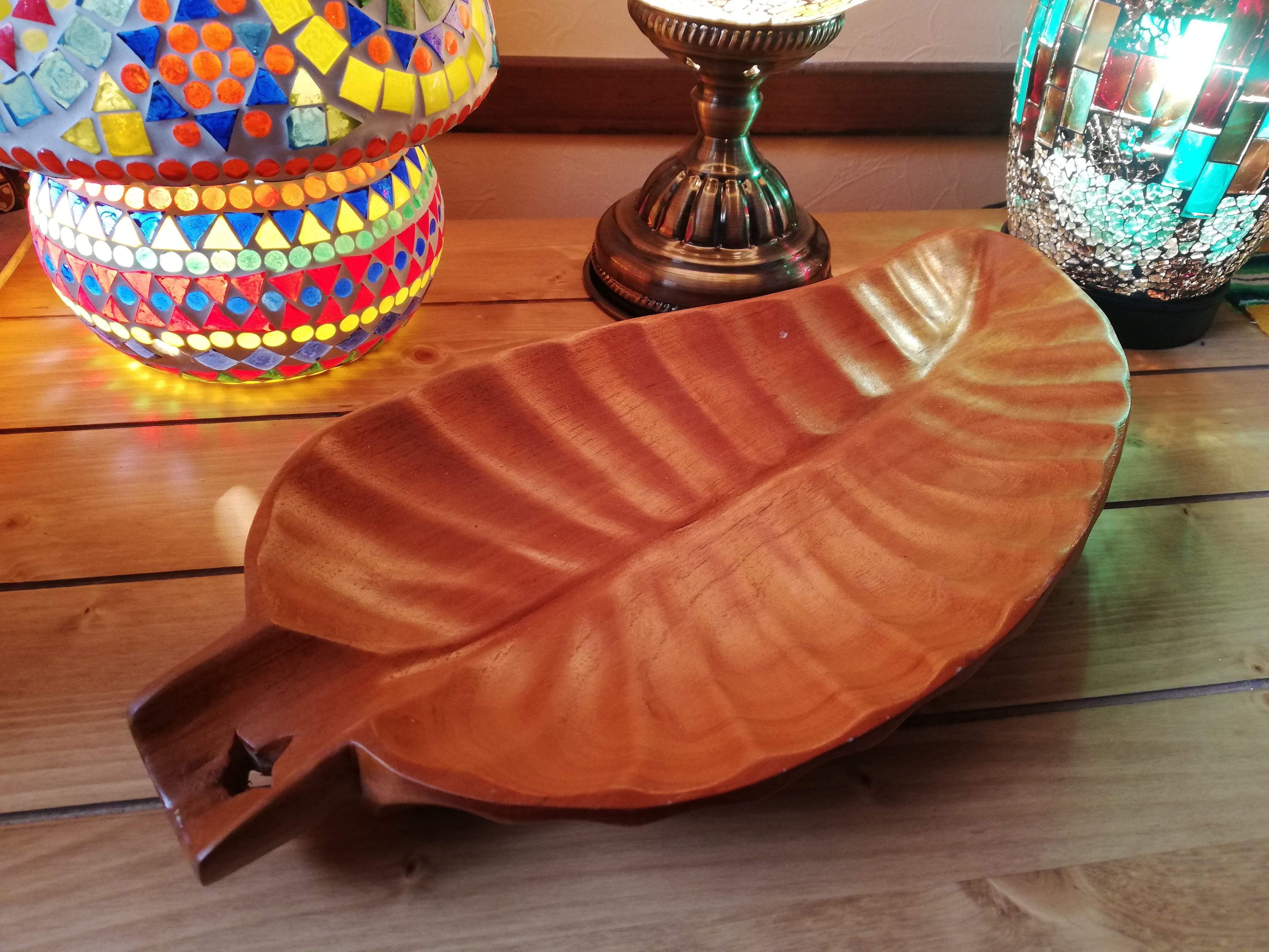フィリピンの木を使いフィリピンの職人さんがハンドメイドで作った葉っぱ形の大きなプレートです!フックに掛けて飾ったり吊るしたりできるように穴もあいています!(^^)