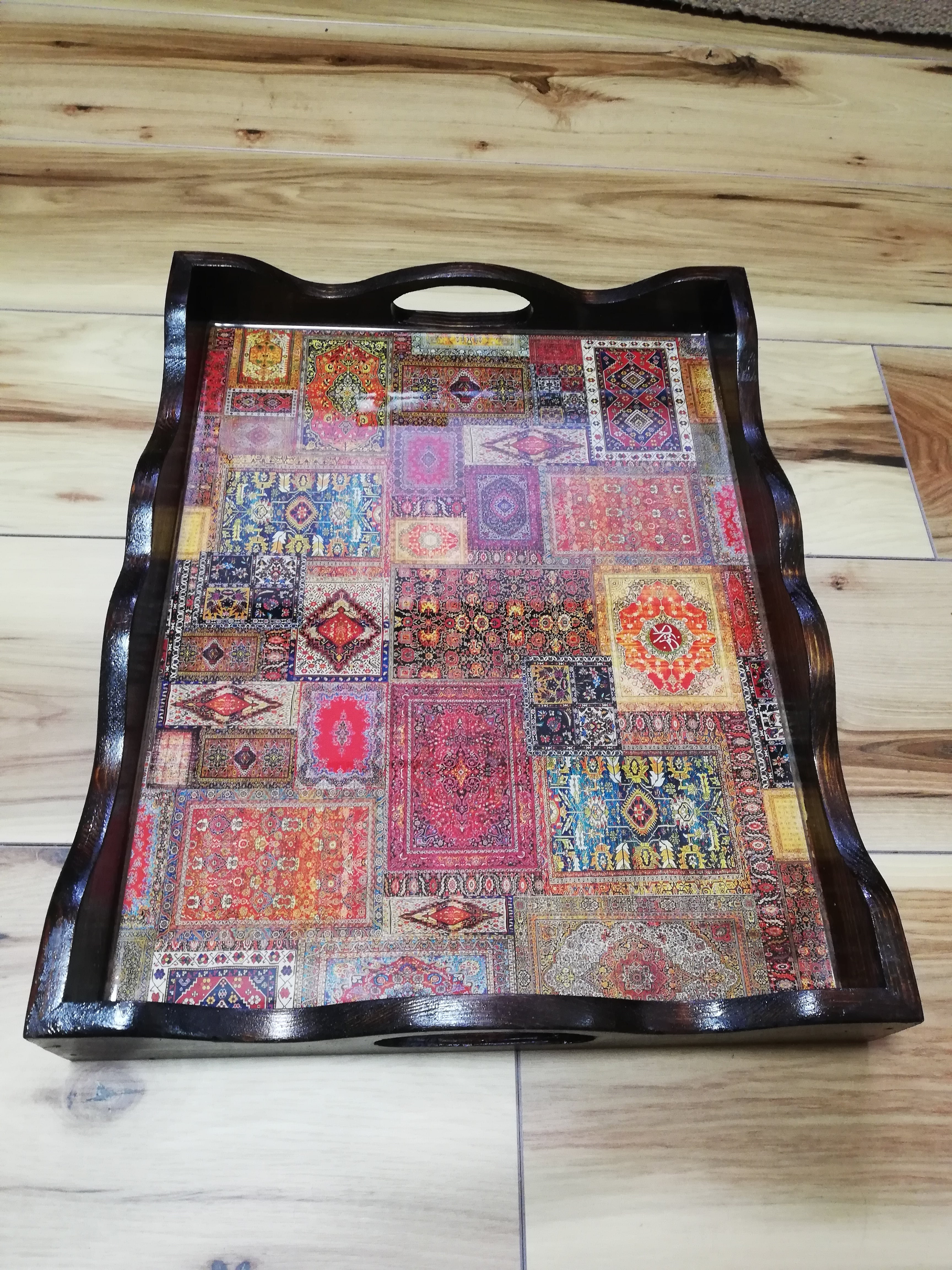 イランのハンドメイドのトレイです!ペルシャ絨毯柄のイランらしいおぼんを使ってTeaなんか運んでこられたら人の目をひく事間違いなしです!!(^^) サイズ 38×30