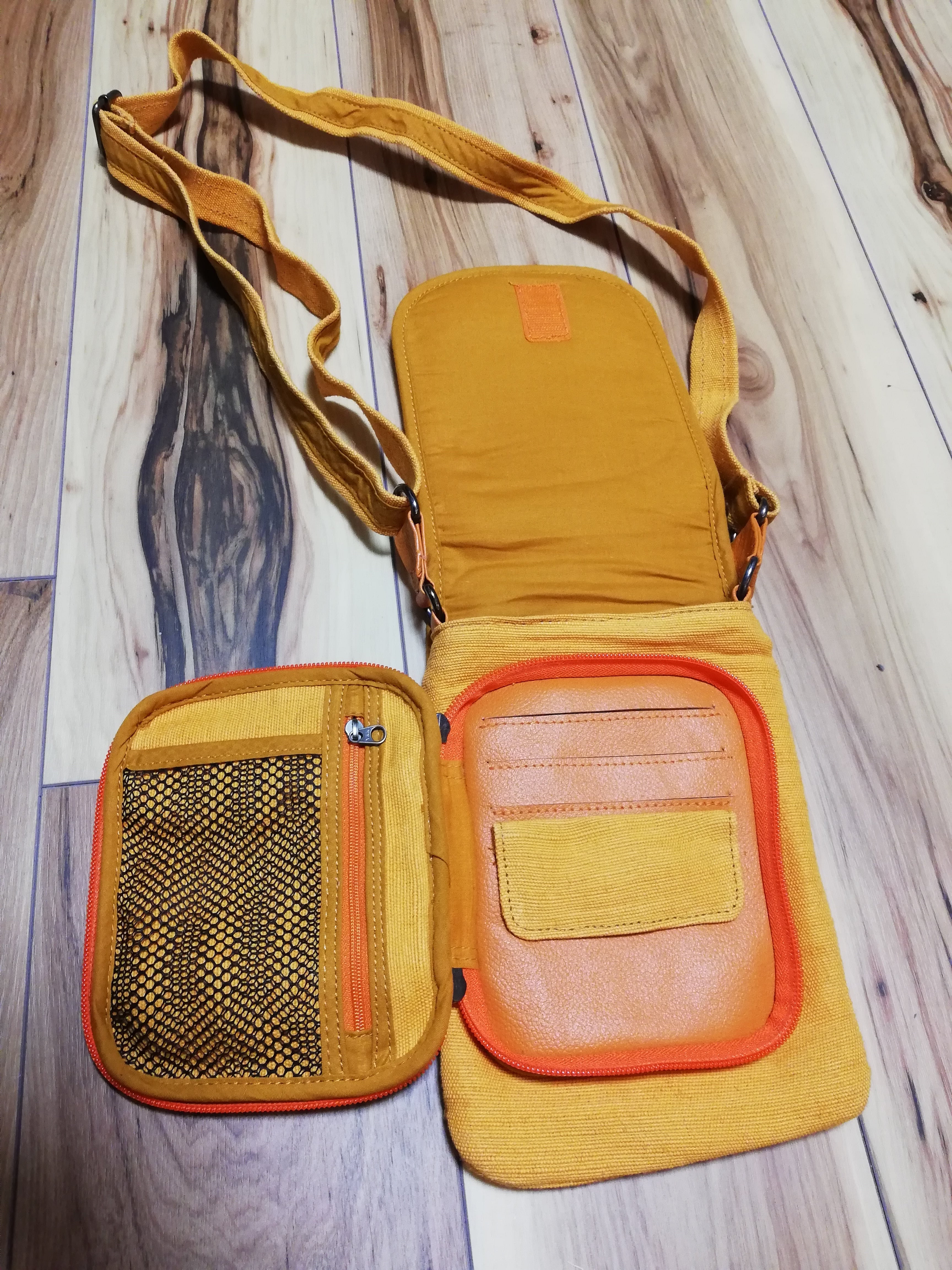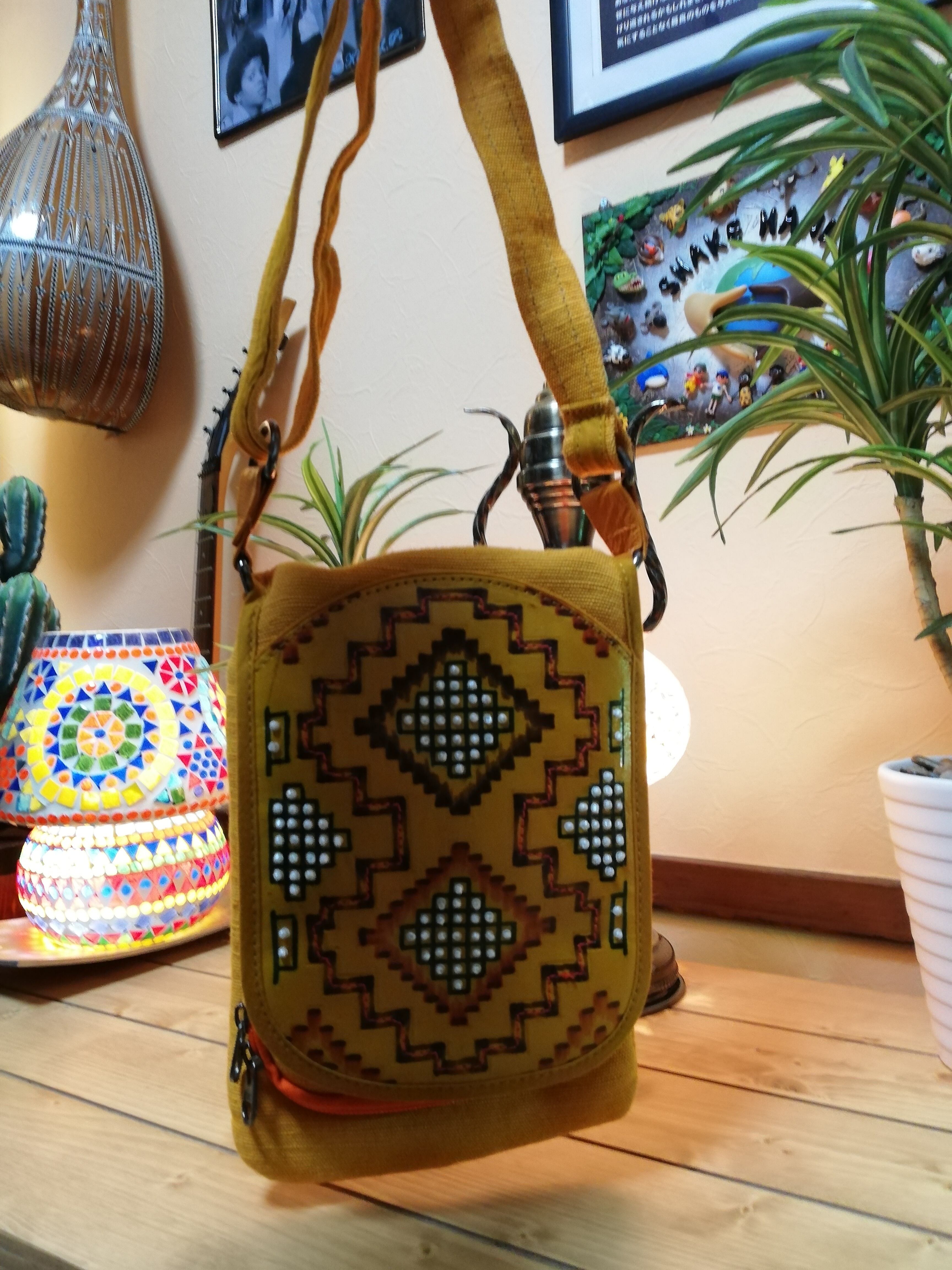バングラデシュのレザーと生地を使いつつ、不思議な形をしたビーズとペイントでデザインしたハンドメイドショルダーバッグです!!