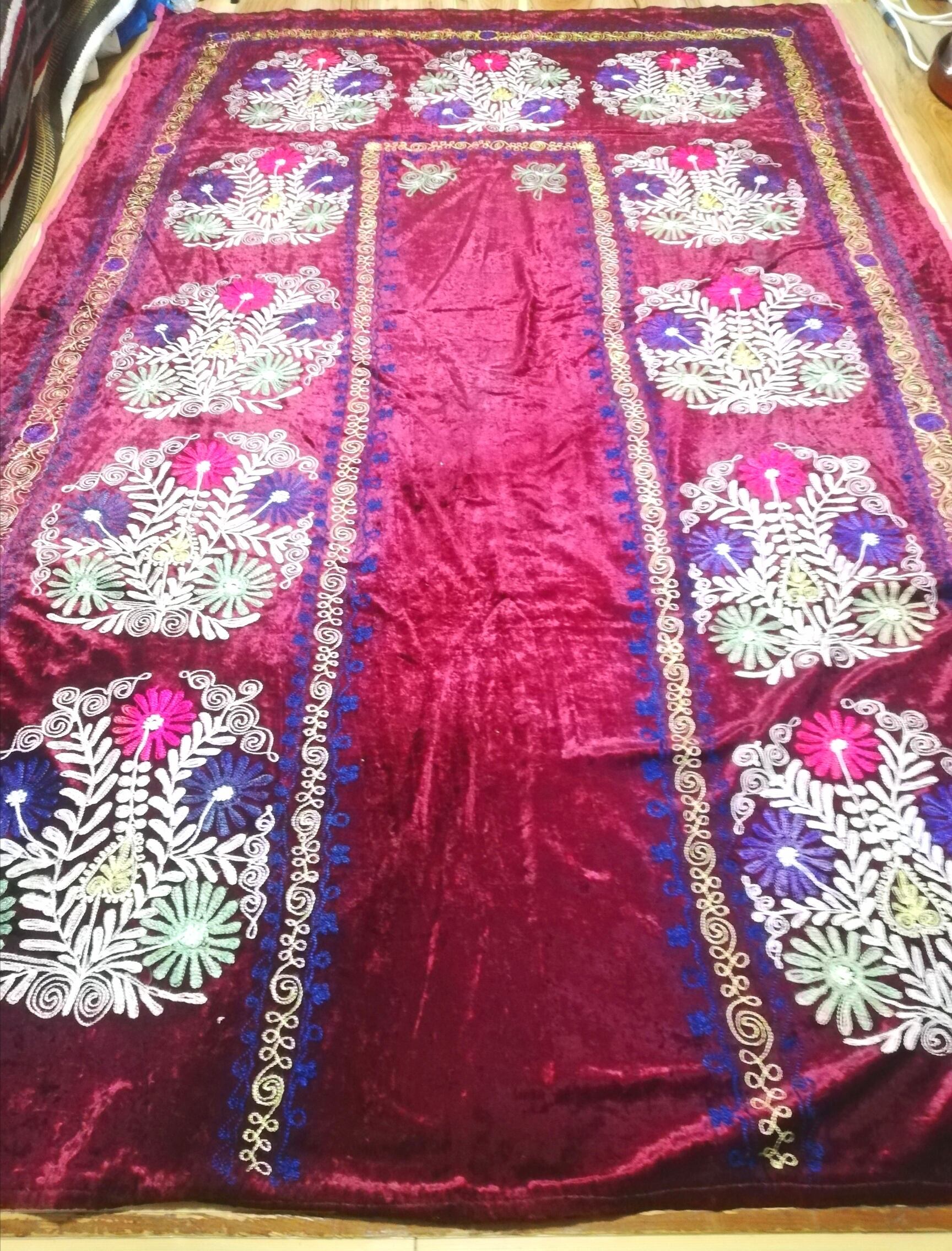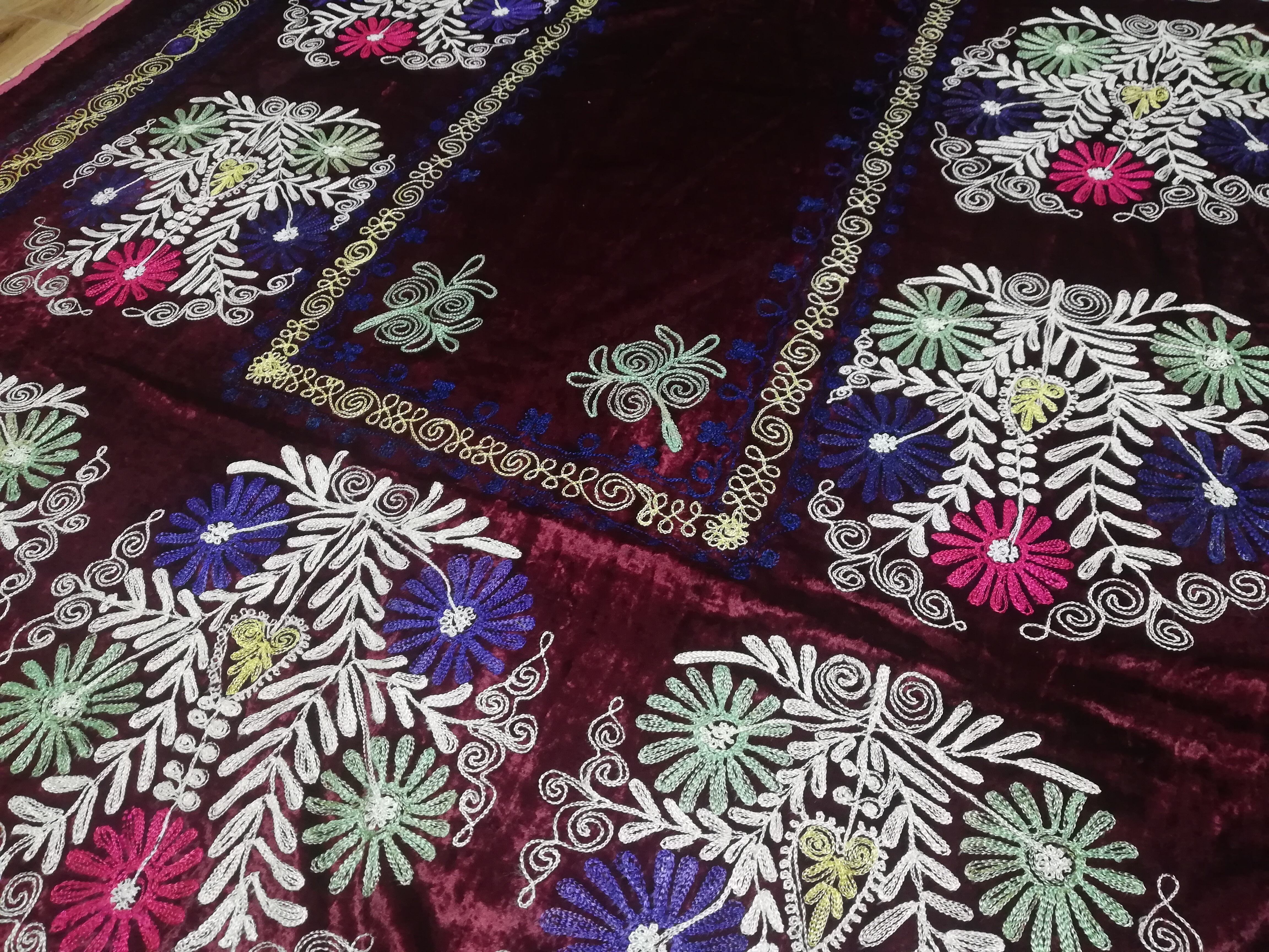 こちらは厚くて肌触りも良い生地にスザニ刺繍をいれたもので本来売られているスザニよりもカーペットとして使うのに適した物となります!