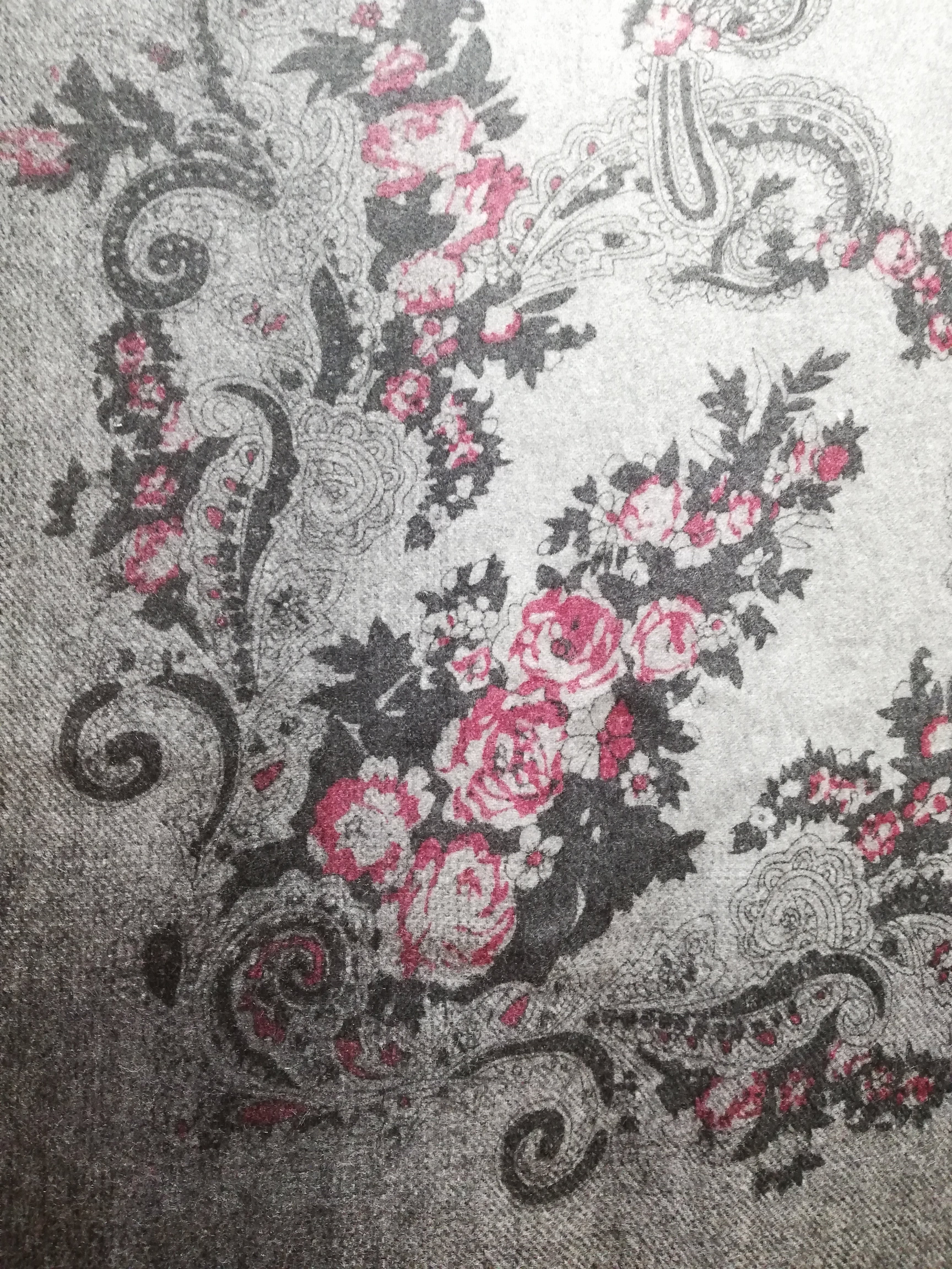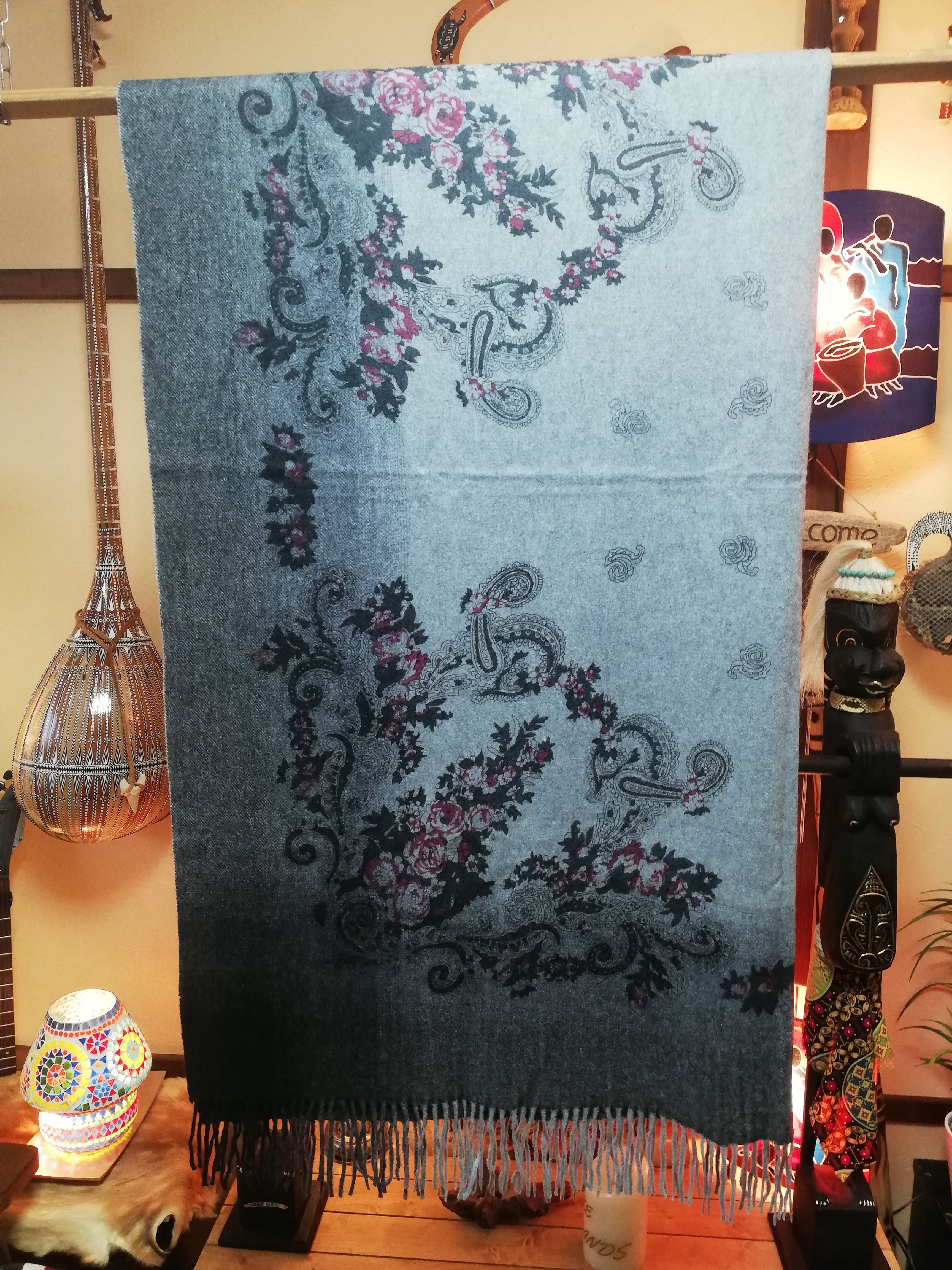 肌触りも良くウイグル独特のデザインが非常に綺麗で、黒とグレーのグラデーションカラーがとてもクールで、首元を暖めたり肌寒い時に羽織ってもとてもオシャレなデザインです!(^^)
