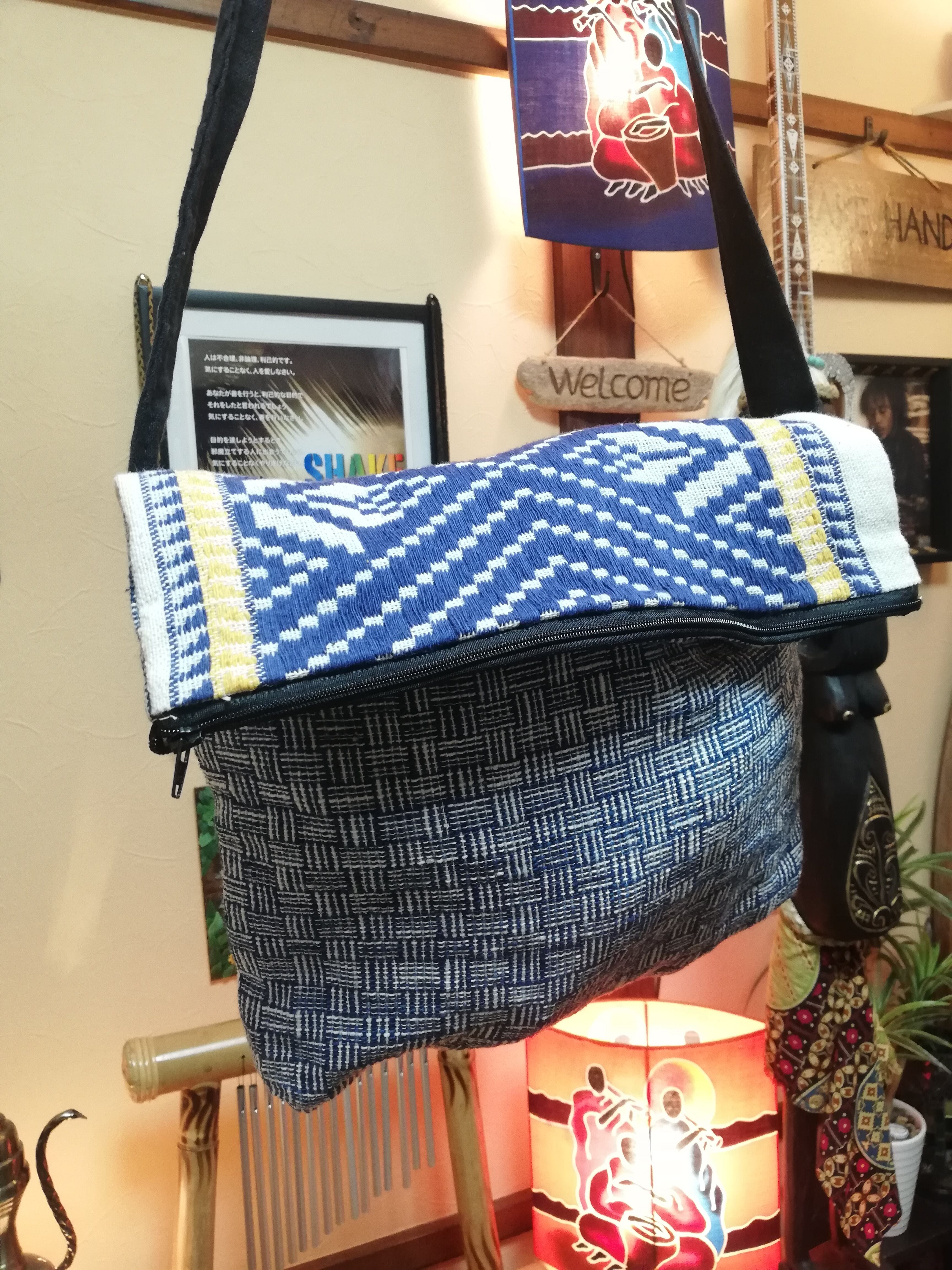 タイの田舎国ラオスで作られたハンドメイドのショルダーバッグで、荷物が少ない時は折りたたみ、荷物が多い時は縦に広げて使うことが出来るちょっと変わったエスニックバッグです!(^^)